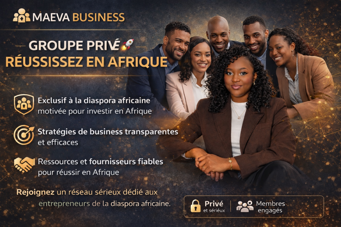Bienvenue dans Maeva Business, une communauté de réseautage premium conçue pour les membres de la diaspora qui veulent avancer sérieusement, investir intelligemment en Afrique et s’entourer des bonnes personnes.