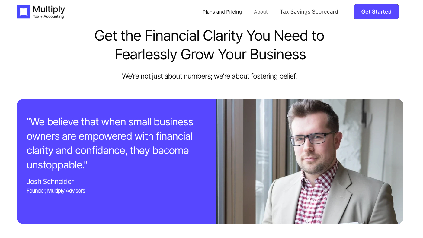 So many business owners struggle to find a real accounting partner to support them in their business growth. They’re constantly worried about what they didn't know and up at 3 am watching YouTube videos on tax strategies wondering if that would work for them. So what did we do? We interviewed 100 business owners, asked them what they wanted in an accounting firm, and used those answers to build a truly better growth partner in Multiply Advisors.