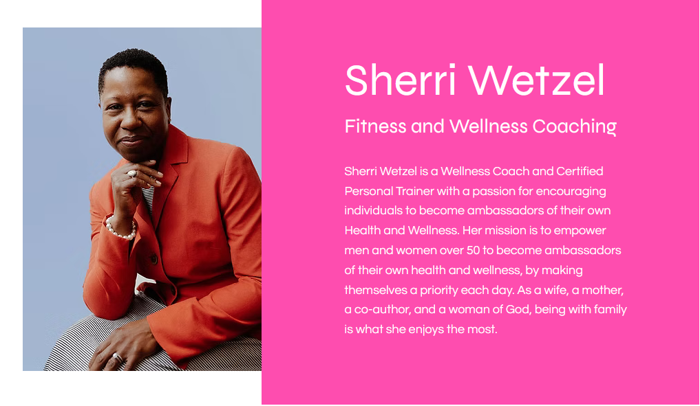 Sherri Wetzel is a Wellness Coach and Certified Personal Trainer with a passion for encouraging individuals to become ambassadors of their own Health and Wellness. Her mission is to empower men and women over 50 to become ambassadors of their own health and wellness, by making themselves a priority each day. As a wife, a mother, a co-author, and a woman of God, being with family is what she enjoys the most.