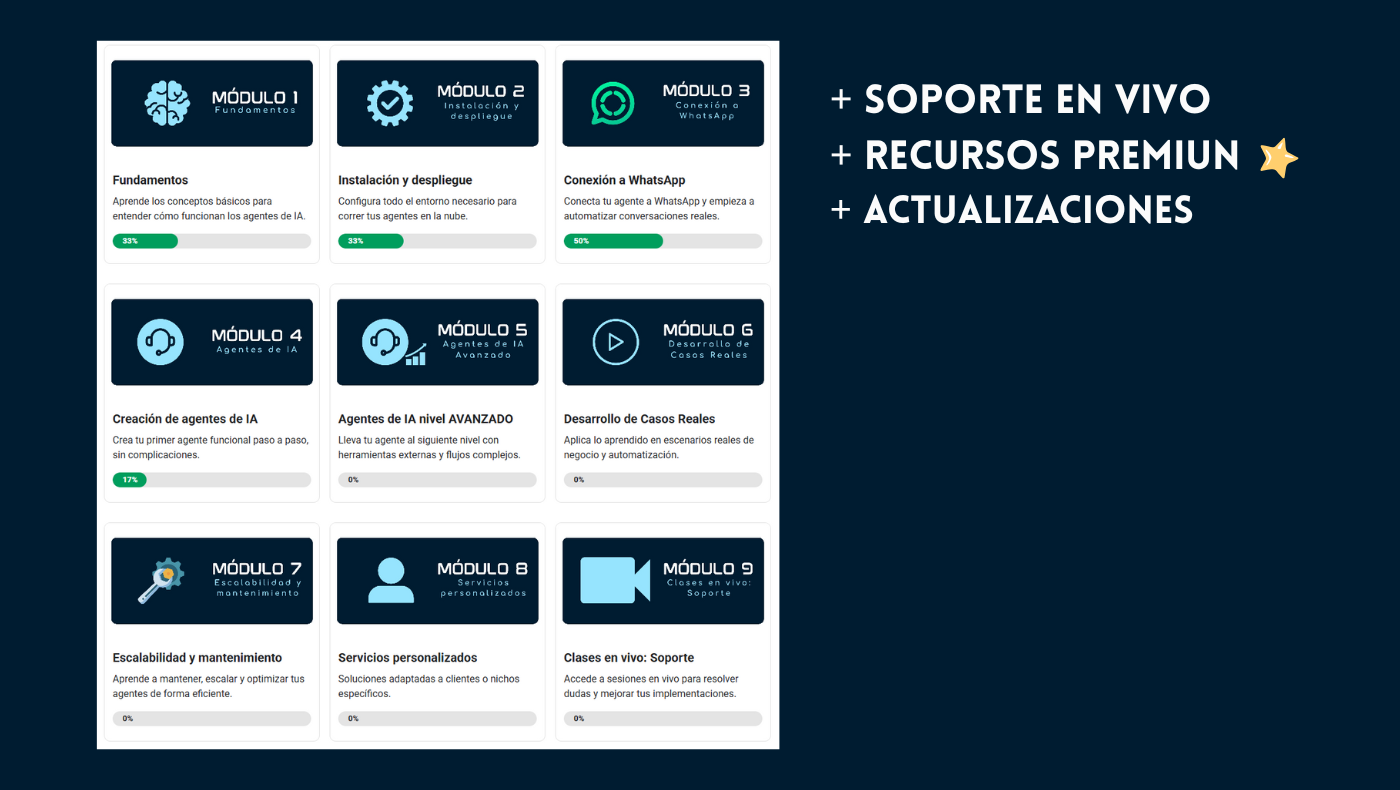 Que no dependas de terceros. Que aprendas y entiendas al 100% cómo funcionan los agentes de IA y cómo implementarlos en tu negocio, para que tú y tu equipo puedan crear, mantener y escalar cualquier automatización que necesiten.