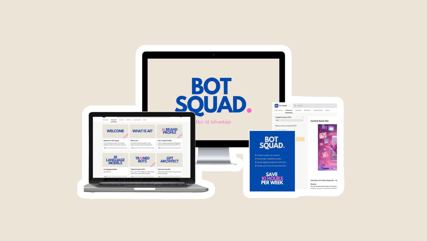 Bot Squad is the go to AI powered business academy for women entrepreneurs who want to work smarter, not harder. We help coaches, service providers, content creators, and digital product sellers leverage AI tools to save time, generate more leads, and scale their businesses—without burnout.