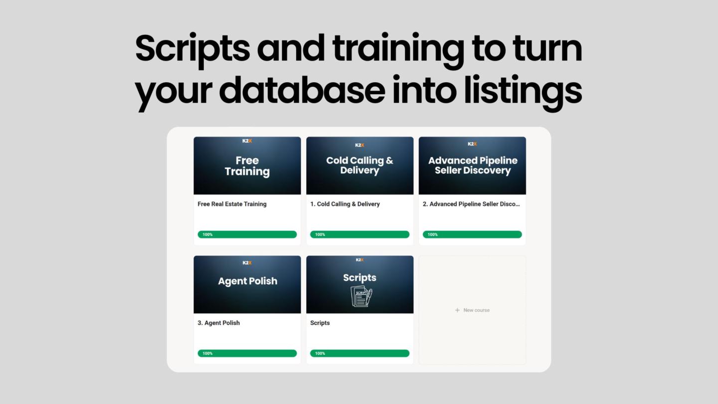 The full K2X real estate listing and prospecting method in digital form. Scripts and training to turn your database into listings.