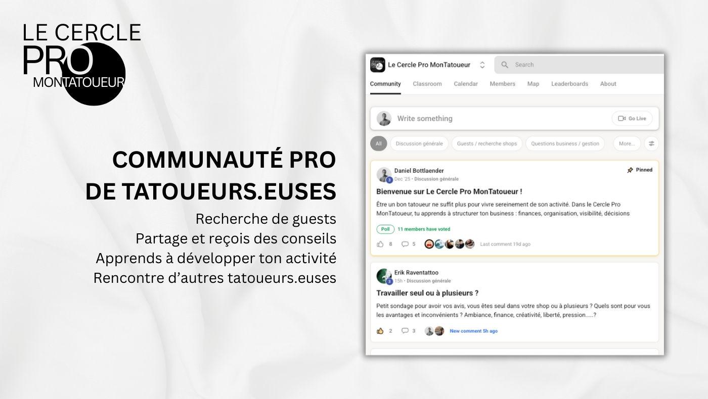 Le Cercle Pro MonTatoueur est une communauté privée pour t’aider à structurer ton activité, stabiliser ton planning et devenir une vraie destination tatouage, être choisi pour ton style et ta réputation, sans finir en burnout.