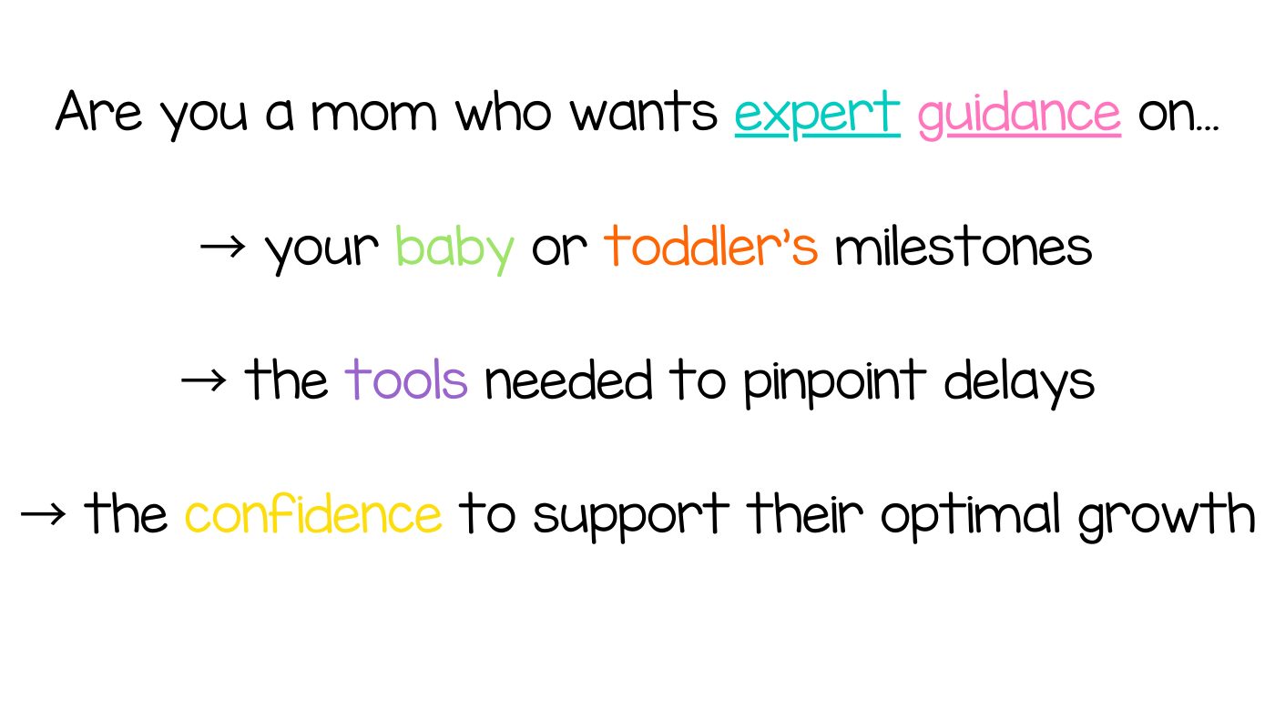 Milestone Mom Academy is a community for moms who want to understand their baby and toddlers' milestones, pinpoint delays, and take early action to support optimal development.