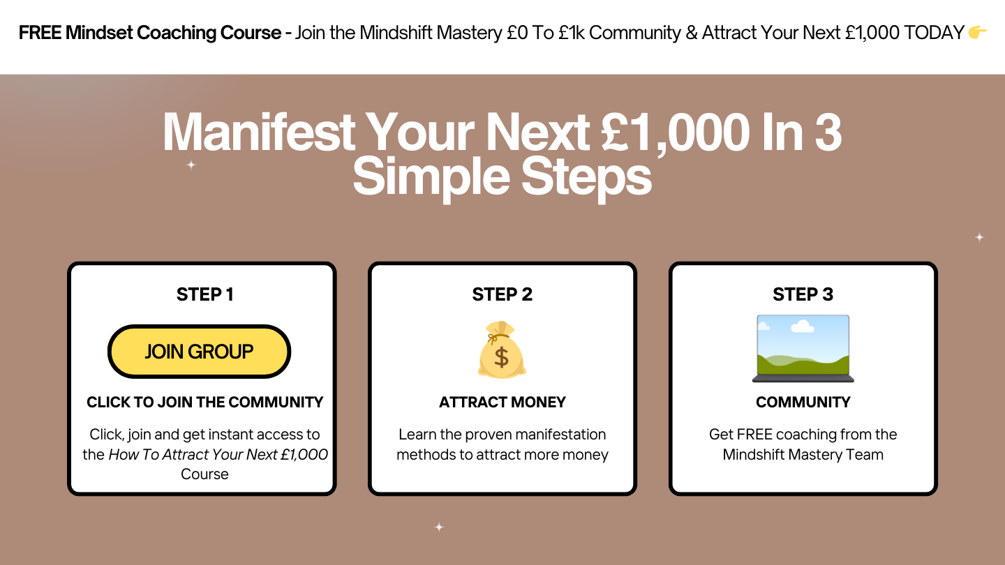 👋 Join the Mindshift Mastery - £0 to £1k Community & learn how to manifest £1,000 a month (step by step) by using the using the Law Of Attraction & other manifestation techniques.