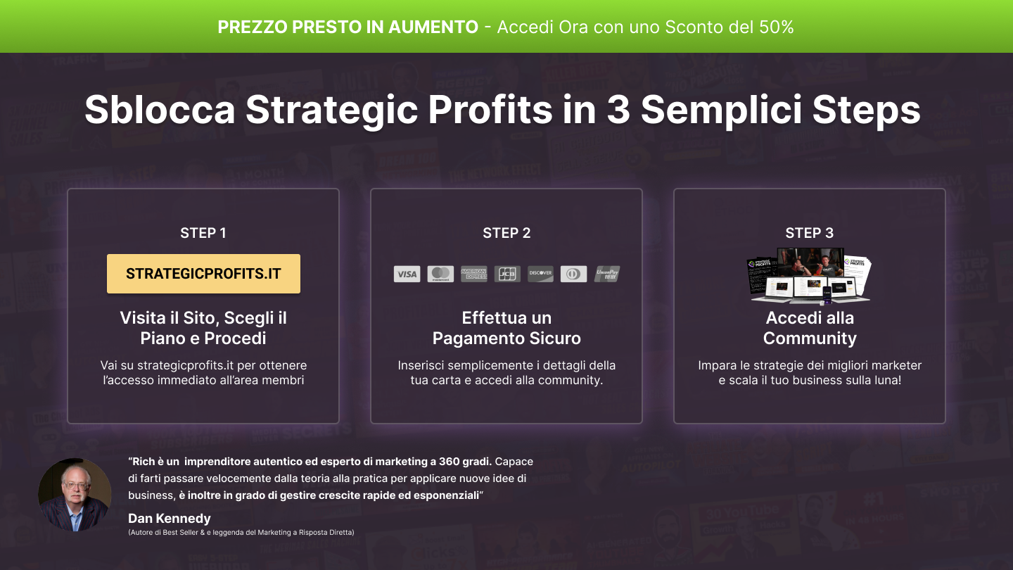 ๐ Entra a far parte della Community di Strategic Profits Italia e scopri ora cosa stanno facendo i migliori Marketer ed Imprenditori al Mondo per aggiungere ogni mese migliaia di clienti al loro Business.