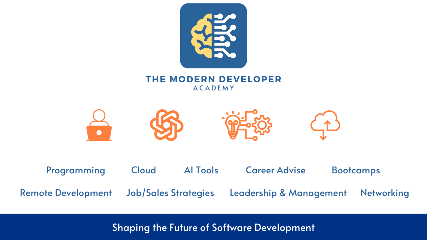 At The Modern Developer Academy, you’ll have access to cutting-edge resources, interactive workshops, mentoring, and real-world examples designed to elevate your skills and propel your career forward. I will help you shape your career to be successful in an era where AI has transformed the way we learn, work, program, and think.