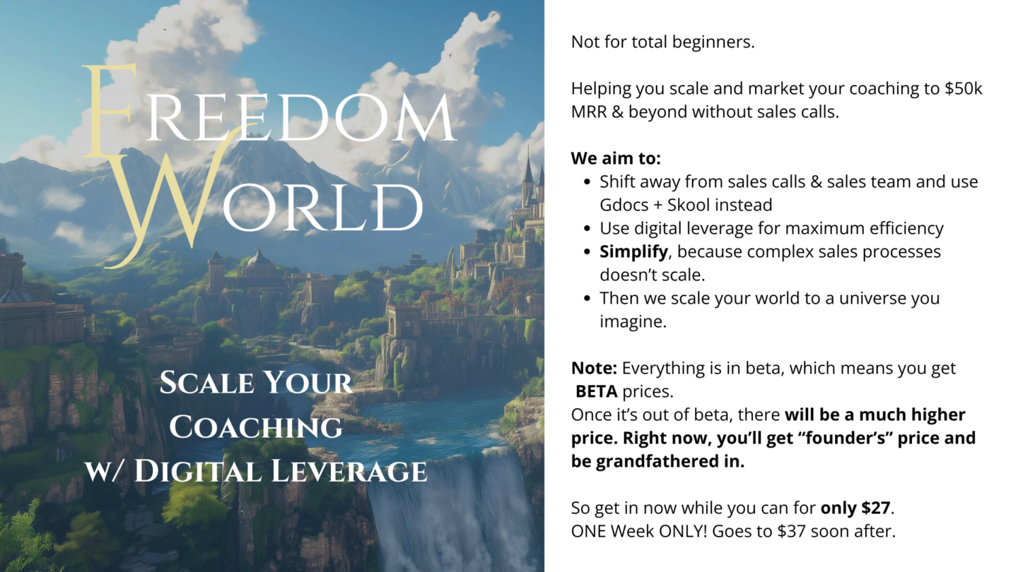 It's called freedom world - established coaches world-building their $50k+ MRR coaching business with freedom, abundance and digital leverage as its centerpiece
